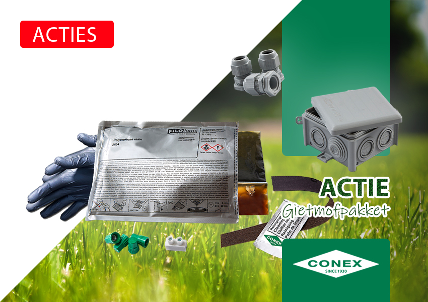 Een mooie aanbieding dit voorjaar, de CONEX gietmof! Een compleet pakket om je kabels waterdicht te verbinden. Klik op de afbeelding en bekijk de voorjaarsactie.