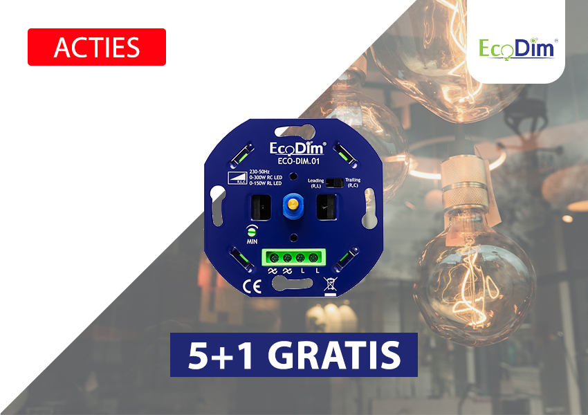 Bestel 5x de ECO-DIM.01 en ontvang er 1 extra. De actieset koop je voor slechts €189,- (€31,50 per dimmer). Klik op de actie en bestel jouw actieset.v